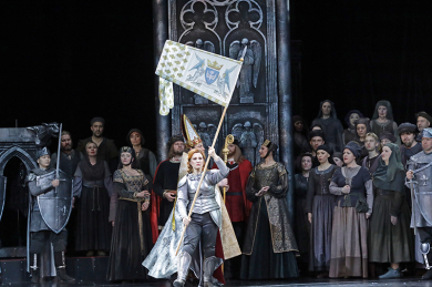 Giovanna engages in a duel with Lionel, a Burgundian allied with the English. But when she is about to strike the deadly blow, Joan sees his face, evoking tender pity. They immediately fall in love. Lionel swears allegiance to the French cause. At the cathedral of Reims a great crowd forms to celebrate Charles’ coronation. Thibaut publicly accuses Joan of witchcraft. Dunois defends her and the archbishop questions her. Feeling guilty of her love for Lionel, Joan remains silent. Lionel implores her to run away; but she accuses him that his love has caused her downfall.