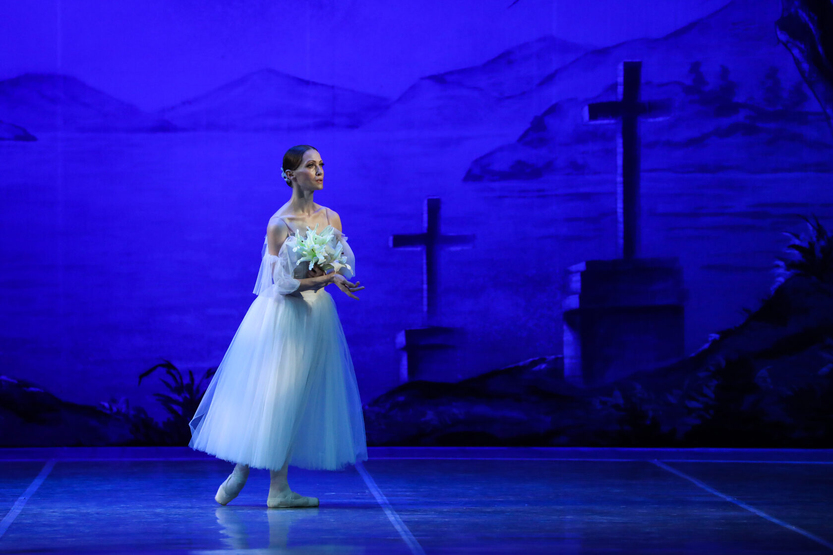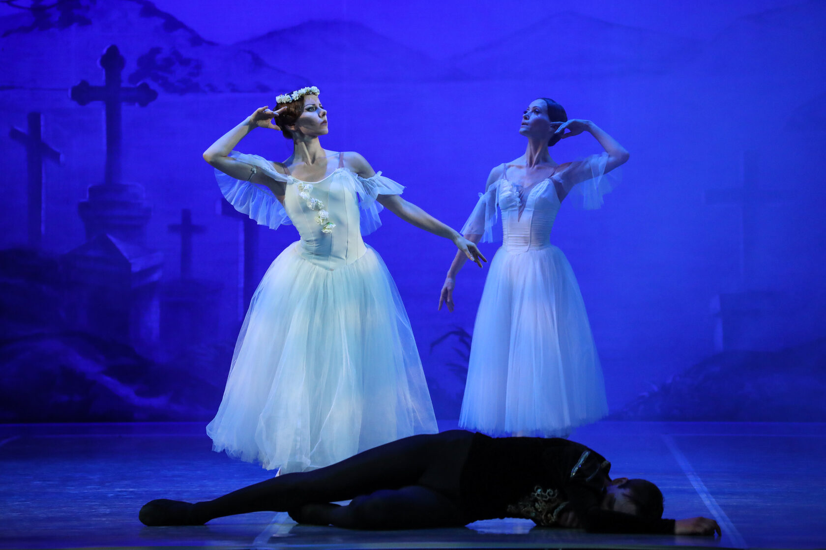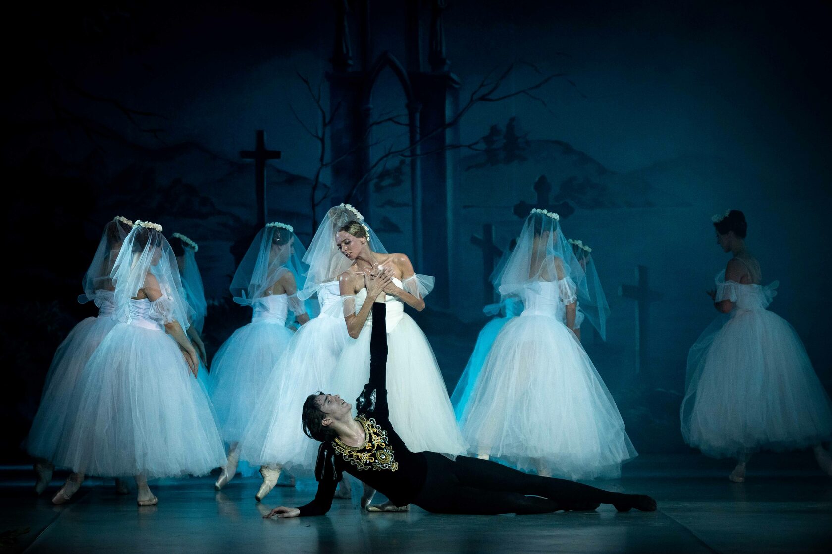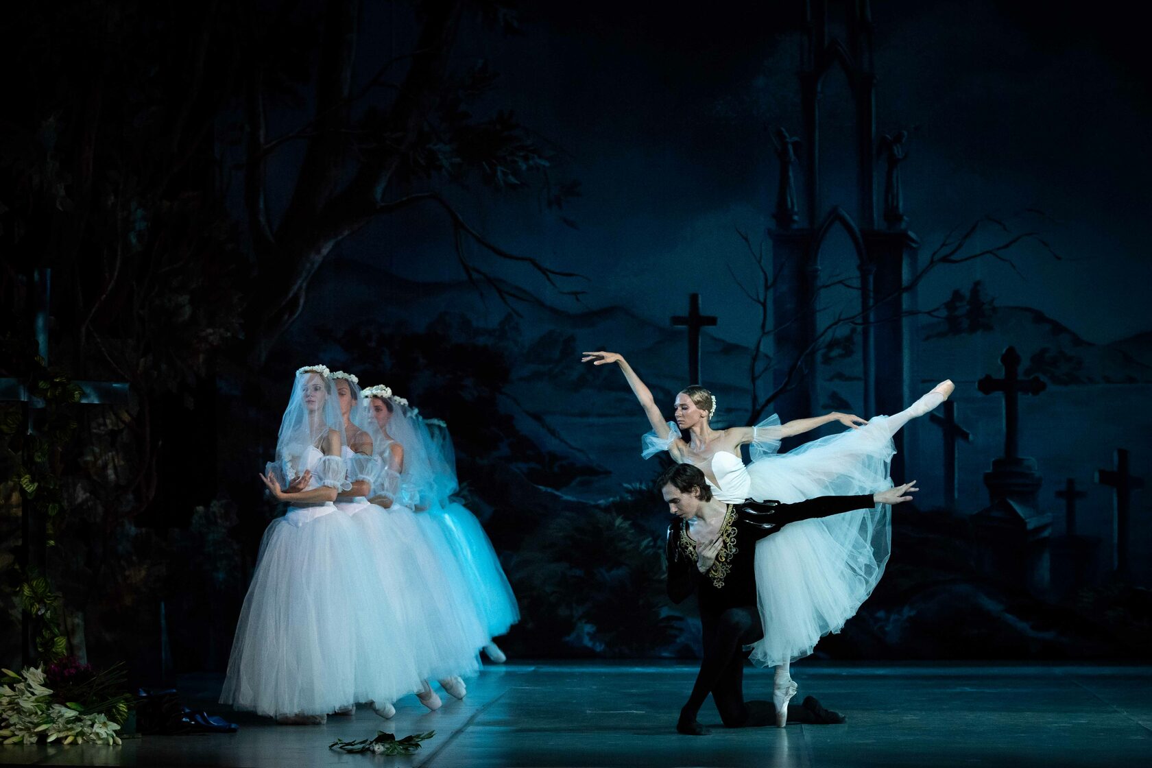 Act II Night-time. The ghostly forms of the Wilis, died brides, appear among the graves of the village church yard which is bathed in moonlight. “Dressed in bridal gowns and garlands of flowers...The irresistibly beautiful Wilis danced to the light of the moon. And as they felt the time given them for dancing was running out and that they had again to return to their icy graves, their dancing became more and more impassioned and rapid...” (Heinrich Heine).