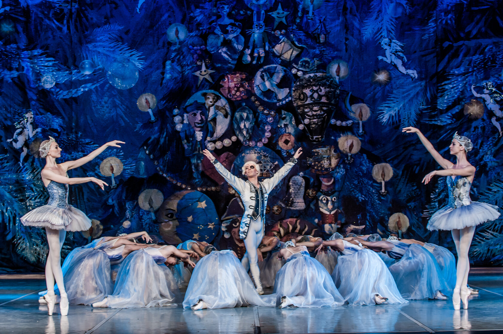 The walls of the house disappear. Marie and her friends are standing under a star-studded sky, by a fairy-tale Christmas tree. Snowflakes go round in a magical dance. Marie and her Nutcracker-Prince, beckon, as if to a beautiful dream, to the twinkling star at the top of the Christmas tree. They climb into a magic boat and set off for the top of the tree. The dolls follow behind them.