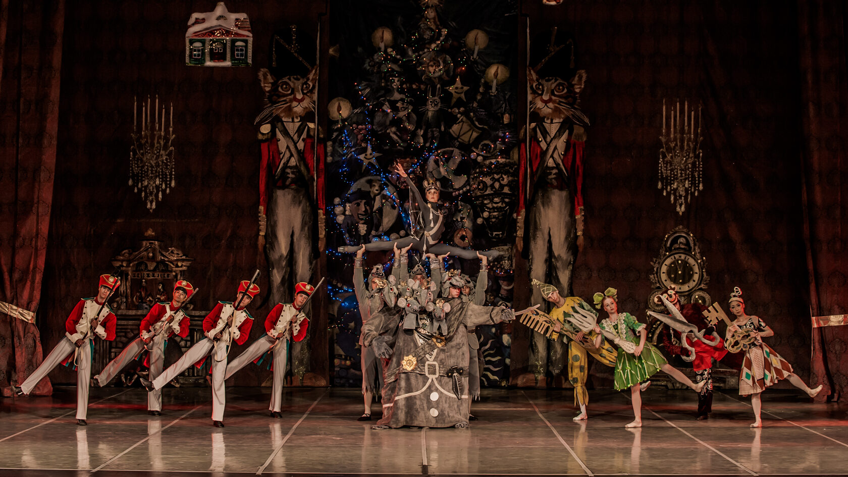 Act II Marie and Nutcracker-Prince are sailing in their magic boat through the Christmas tree kingdom. There are their friends, the dolls with them. The shining star is getting closer and closer. They are just about to reach the top of the tree when they are suddenly attacked by the mice and the Mouse King who have crept up behind them. Once again, the Nutcracker-Prince goes boldly into battle. Horribly frightened, Marie and the dolls watch the fight. The Nutcracker-Prince vanquishes the enemy. Joyous victory celebrations are underway. The dolls dance, the candles burn even brighter, the Christmas tree comes alive. The evil mice have been defeated. Marie and the Nutcracker-Prince are radiant with happiness — they have reached the kingdom of their dreams! But it appears all this was just a dream. Christmas Eve is over and with it all wonderful reveries. Marie, still in the thrall of the fabulous dream, is sitting at home by the Christmas tree, with the Nutcracker-Doll on her lap.