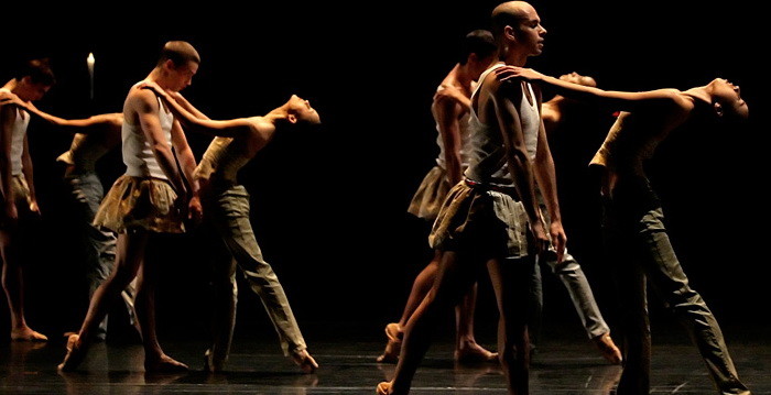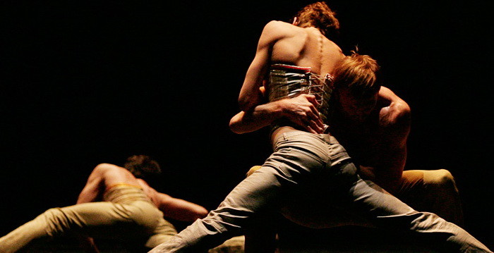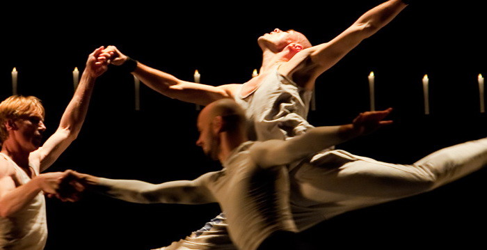 The arch of candles, which constitutes a kind of setting is a gentle light which is almost liturgical. It underlines the architecture of the body, marks the postures, the accents, the states, the motifs drawn by the limbs of the dancers and intensely focuses the regard on the details, the curve of the movement. Its flickering and its folds, like the regard, stops in statue like form, on the fold of a gesture, the ribbed aplomb of a dress or the grimace of a gargoyle.