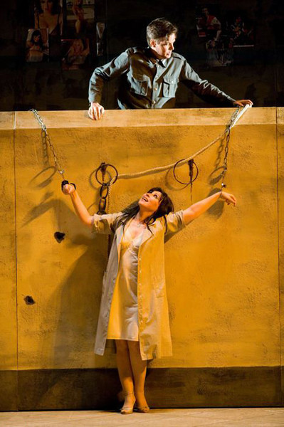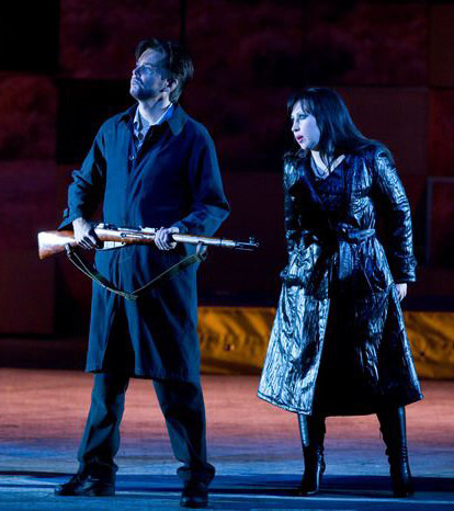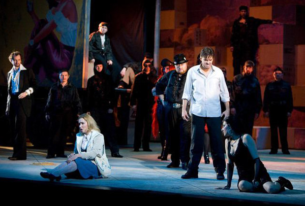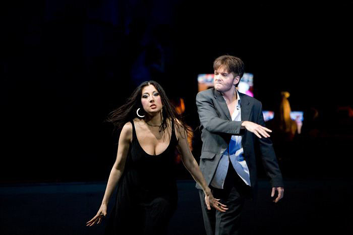 Act IV A square in front of an arena where a bullfight is about to start. Carmen and Escamillo arrive together, they are happily in love. Frasquita and Mercédès warn Carmen to beware of José, but Carmen is intrepid. She stays behind the crowd and meets José face to face. José implores Carmen to go with him and love him again, but she is adamant: her heart belongs to another. Desperate and enraged, José kills Carmen.