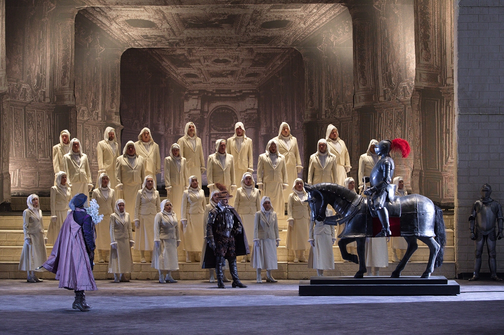 Armed guards are searching for a mysterious stranger hiding near Ravenswood Castle. This secret troubles Lord Enrico, head of the Ashton family. He fears Edgardo of Ravenswood, whose father was killed and whose family was driven from their ancestral home. To secure the favor of the new monarch on the throne, Enrico plans to marry his sister Lucia to Lord Arturo Bucklaw, a noble close to the king. But Lucia refuses to marry. The captain of the guard, Normanno, reports that Lucia has often been seen meeting an unknown man—perhaps Edgardo himself. When the soldiers return, they confirm that the stranger is indeed Edgardo. Enrico is furious.
