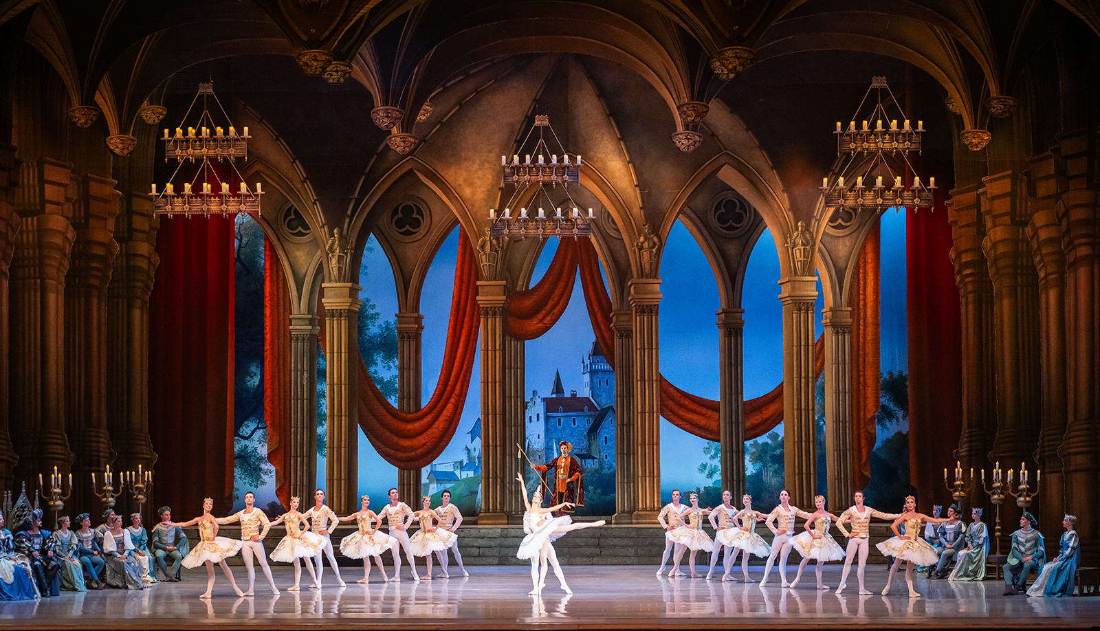 The White Lady appears once more to bless the union of Raymonda and Jean de Brienne. Guests arrive in grand procession for the wedding celebration. The ball opens with a traditional Hungarian dance, followed by dances of the newlyweds and their friends. As the festivities conclude, the guests see the young couple off to the castle granted to them by King Andrew II, marking the joyful beginning of their life together.
