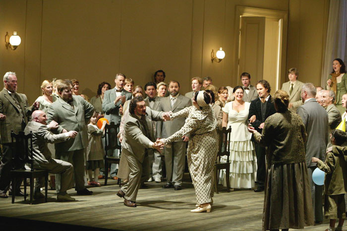 Madame Larina and the nurse Filippyevna are sitting outside in the garden. They can hear Madame Larina's two daughters, Tatyana and her younger sister Olga, singing a love song. Madame Larina begins to reminisce about her own courtship and marriage. A group of peasants enter, and celebrate the harvest with songs and dances. Tatyana and Olga watch. Tatyana has been reading a romantic novel and is absorbed by the story; her carefree sister, on the other hand, wants to join in the celebrations. Madame Larina tells Tatyana that real life is very different from her novels. Filippyevna announces that visitors have arrived: Olga's fiancé Lensky, a young poet, and his friend Eugene Onegin, visiting the area from St Petersburg. The pair are shown in and Lensky introduces Onegin to the Larin family. Onegin is initially surprised that Lensky has chosen the extrovert Olga rather than her more subtle elder sister as his fiancée. Tatyana for her part is immediately and strongly attracted to Onegin. Lensky expresses his delight at seeing Olga and she responds flirtatiously. Onegin tells Tatyana of his boredom in the country and describes the death of his uncle and his subsequent inheritance of a nearby estate. Filippyevna recognizes that Onegin has had a profound effect on Tatyana.