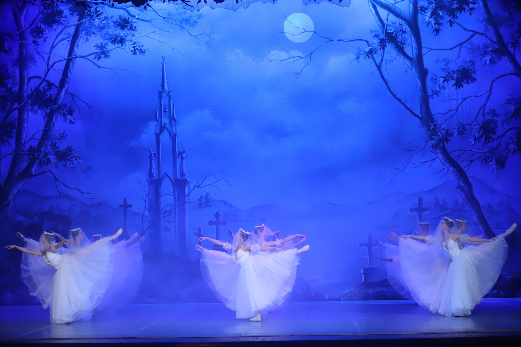 Act II Night-time. The ghostly forms of the Wilis, died brides, appear among the graves of the village church yard which is bathed in moonlight. “Dressed in bridal gowns and garlands of flowers...The irresistibly beautiful Wilis danced to the light of the moon. And as they felt the time given them for dancing was running out and that they had again to return to their icy graves, their dancing became more and more impassioned and rapid...” (Heinrich Heine).