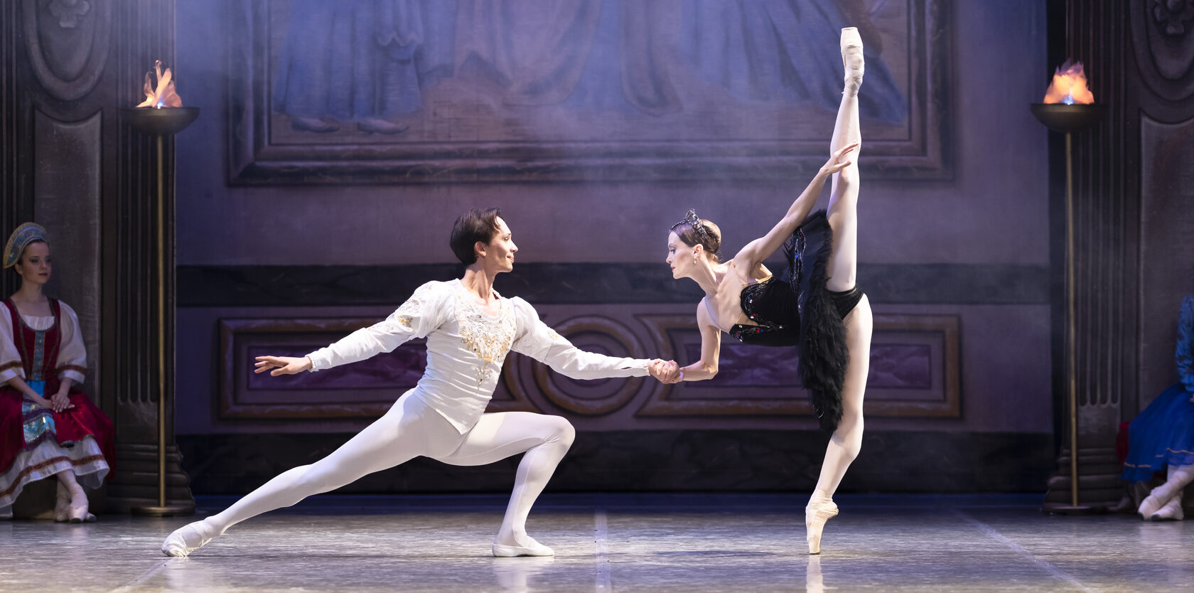 Suddenly, a mysterious knight arrives at the ball accompanied by a ravishingly beautiful young girl and a suite of black swans. It is the Evil Genius and Odile, Odette’s double. Struck by their resemblance, Siegfried hurries towards Odile. The Evil Genius is putting the Prince’s sentiments to the test. Siegfried is enchanted by the perfidious Odile who manages to disarm him of all his doubts. He announces Odile to be his chosen bride. At this very moment, the throne room is plunged in darkness and a vision of the beautiful Odette appears before the assembled company. Siegfried realizes that he has become a plaything in the hands of Fate. Hoping to atone for his betrayal, he rushes in despair after the receding image of the white swan.