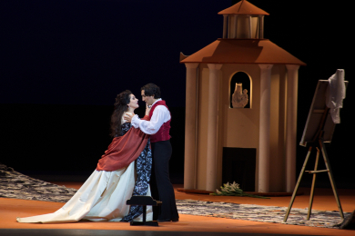 Suddenly Tosca runs in, filled with the story of her recent adventure. Mario caresses the hands that committed the murder for his sake (“O dolci mani”), and the two hail the future.