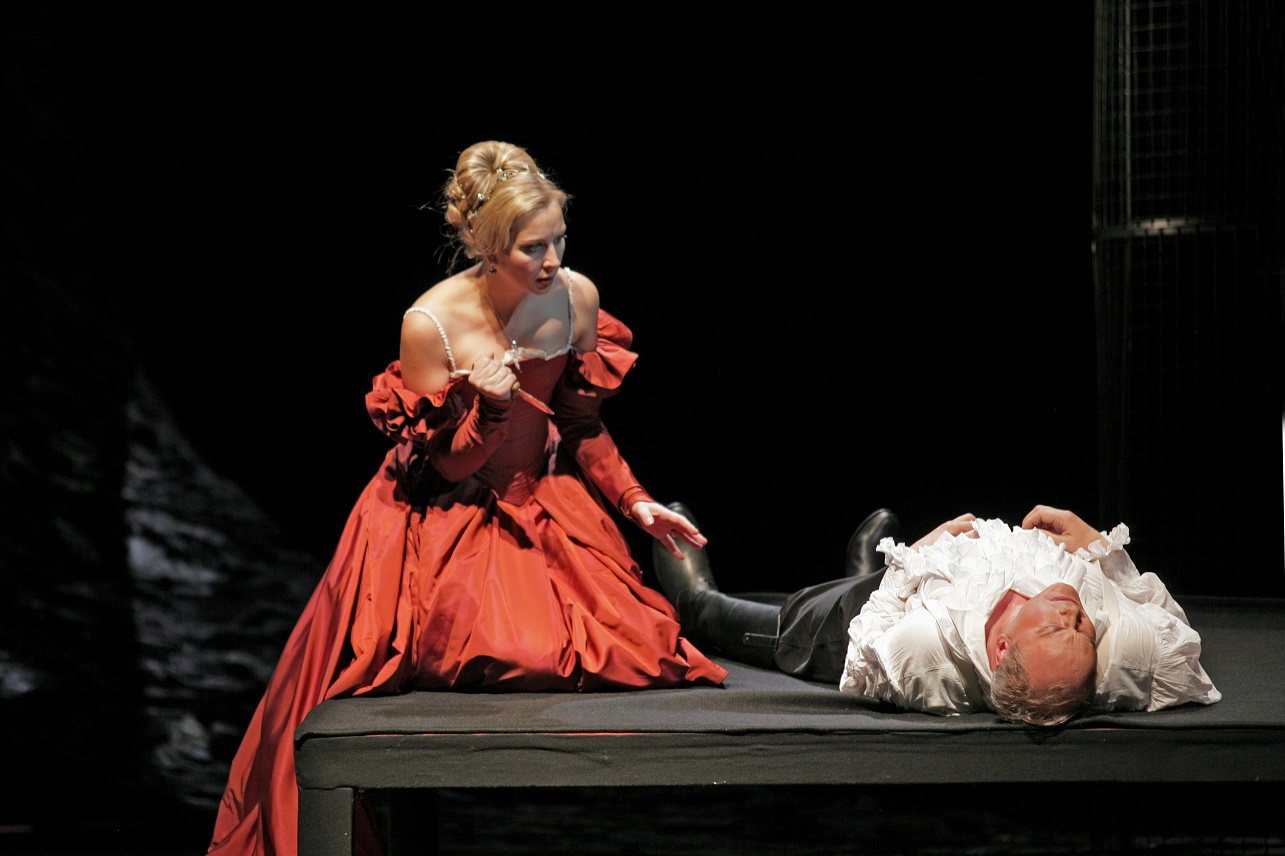 Scarpia prepares a document of safe-conduct for the lovers. When he embraces her, Tosca stabs him with a knife, wrenches the document from his fingers and, placing candles at his head and a crucifix on his chest slips quietly out.